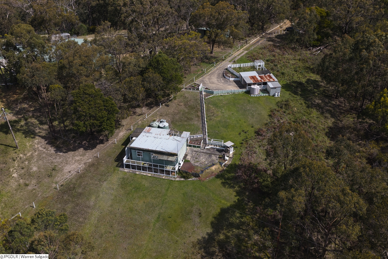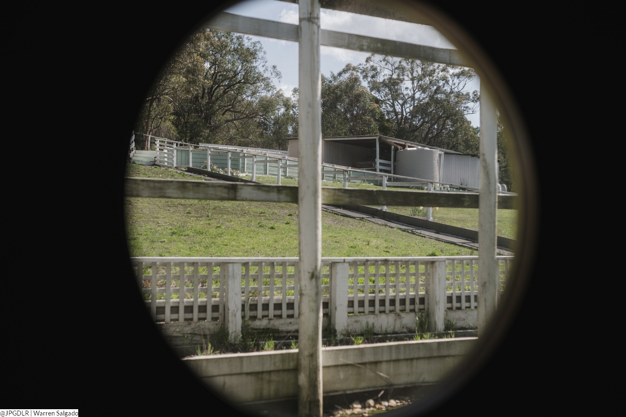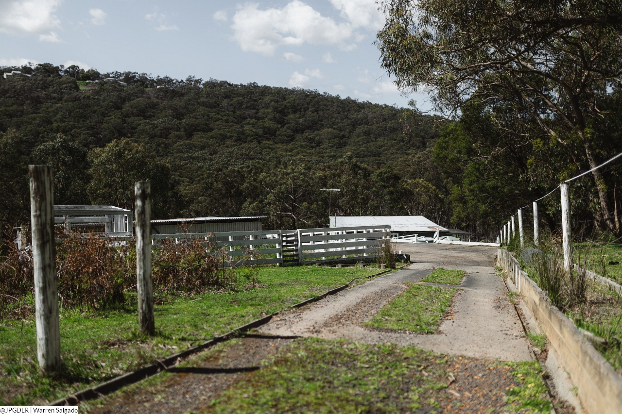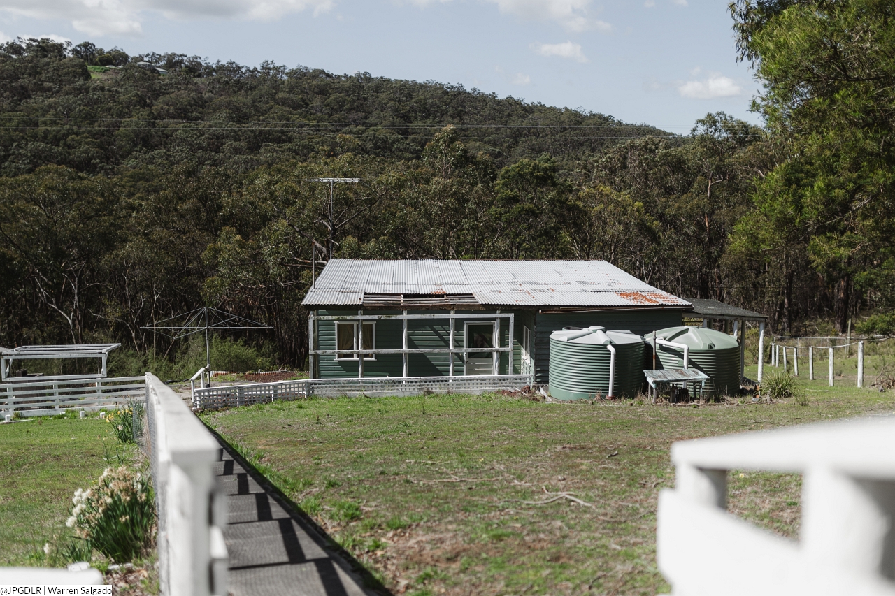The approach is a paved path flanked by white fencing, leading to a green structure that probably once blended into the landscape. Rust creeps across the corrugated roof like lichen on stone. The colours on the old weatherboards, now faded by the harsh sun.
