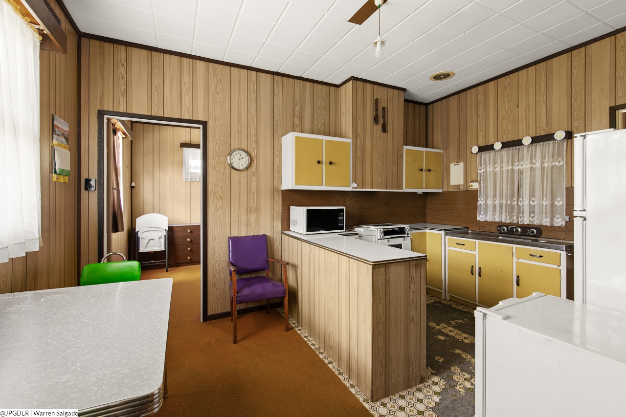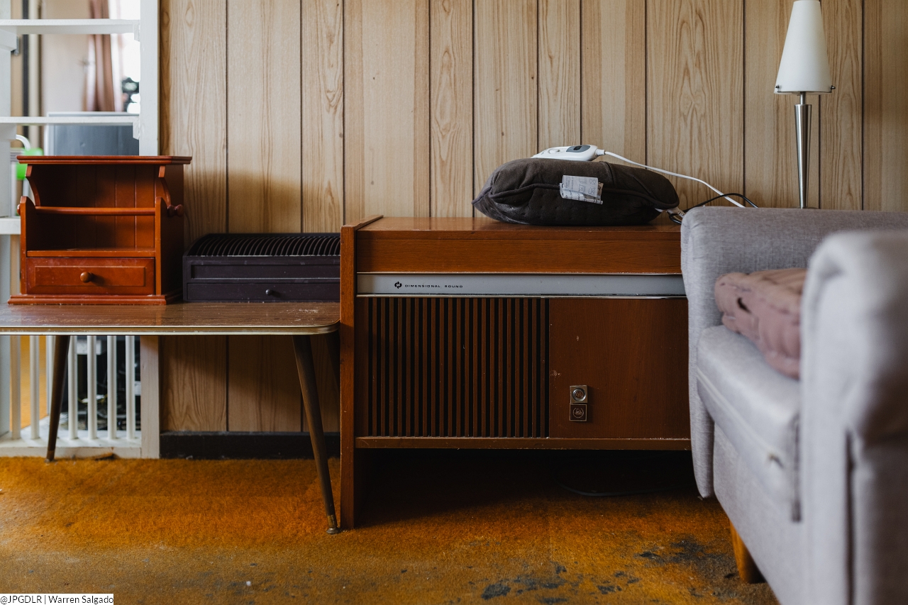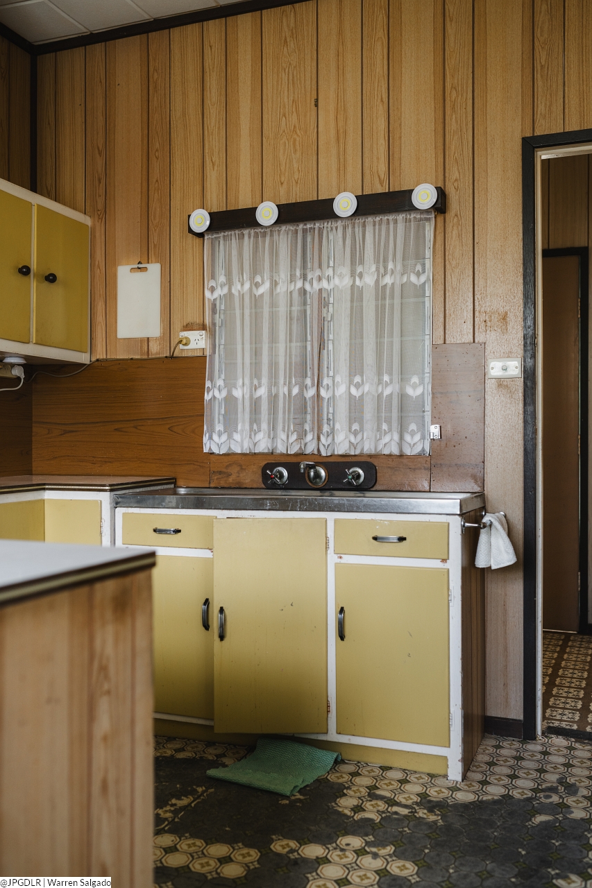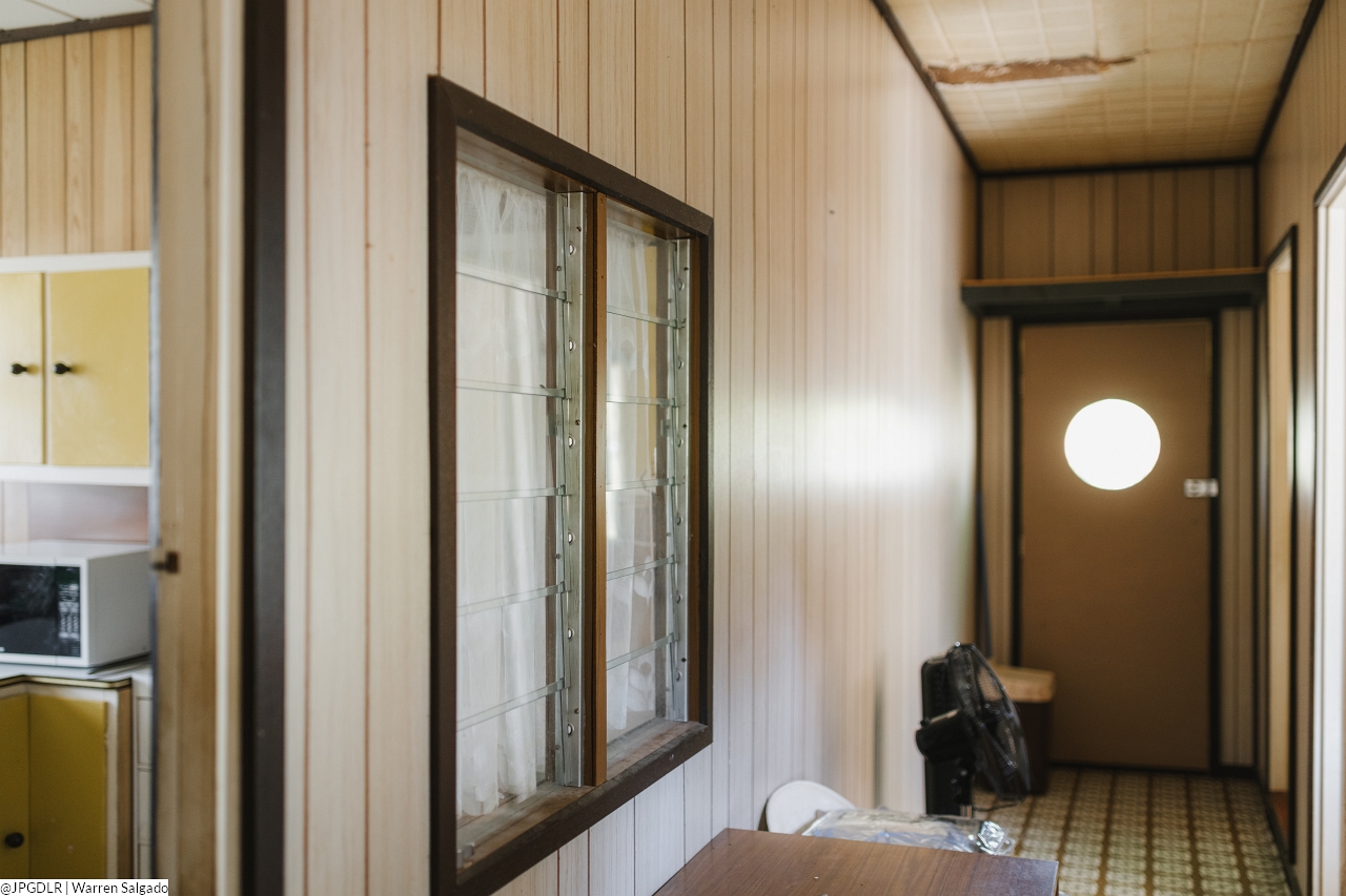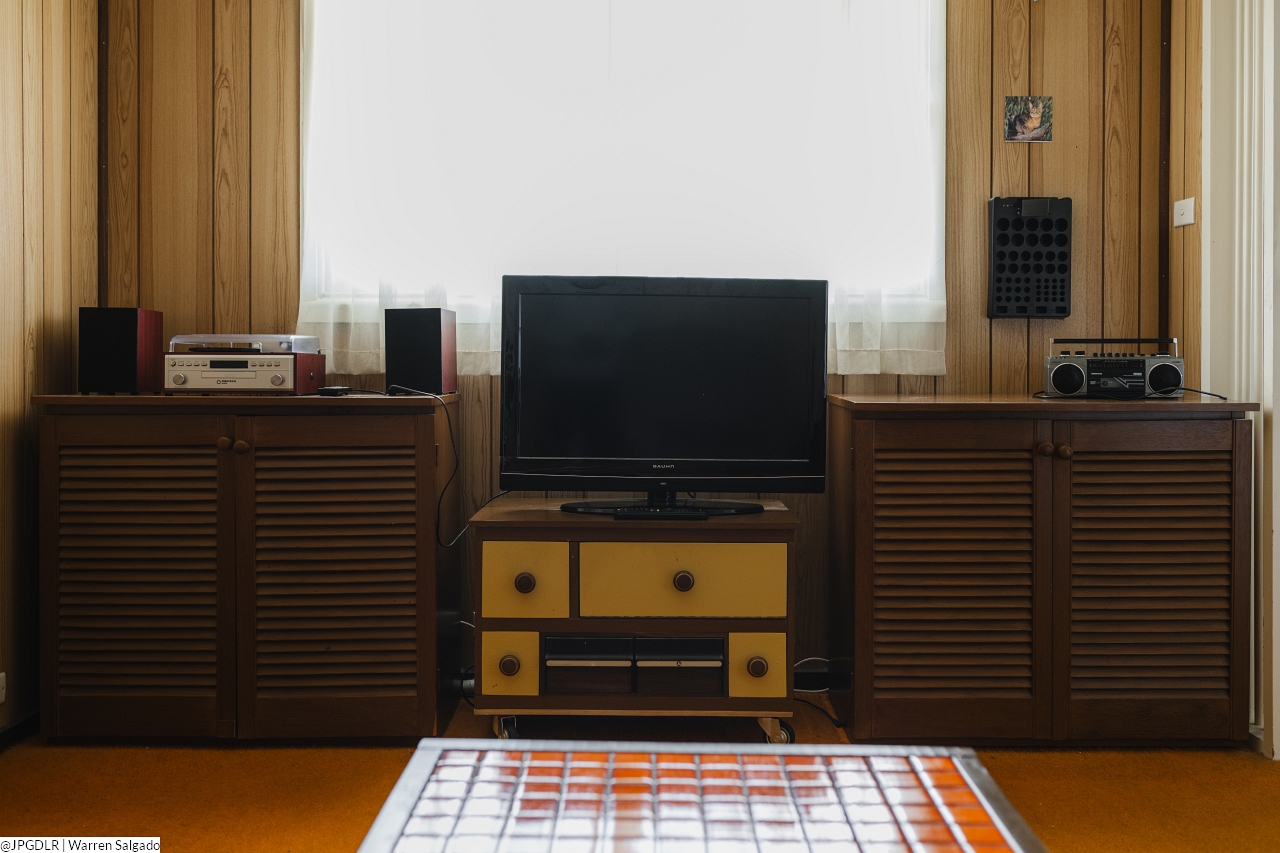 Inside, the rooms are dressed in the textures of a long-gone era—wood panelling, vibrant colours, and flooring that shows memories etched in pressure and time. There are patches of worn carpet and vinyl flooring in the high-traffic areas, and some spots where the occupant paused to rest in front of the TV or to listen to some old tunes.