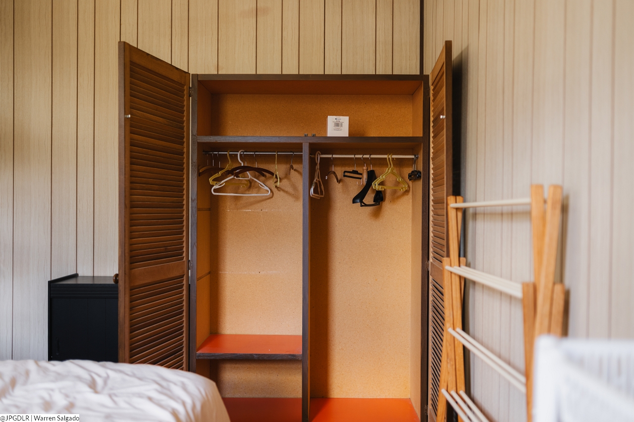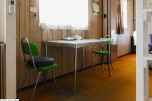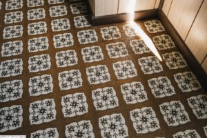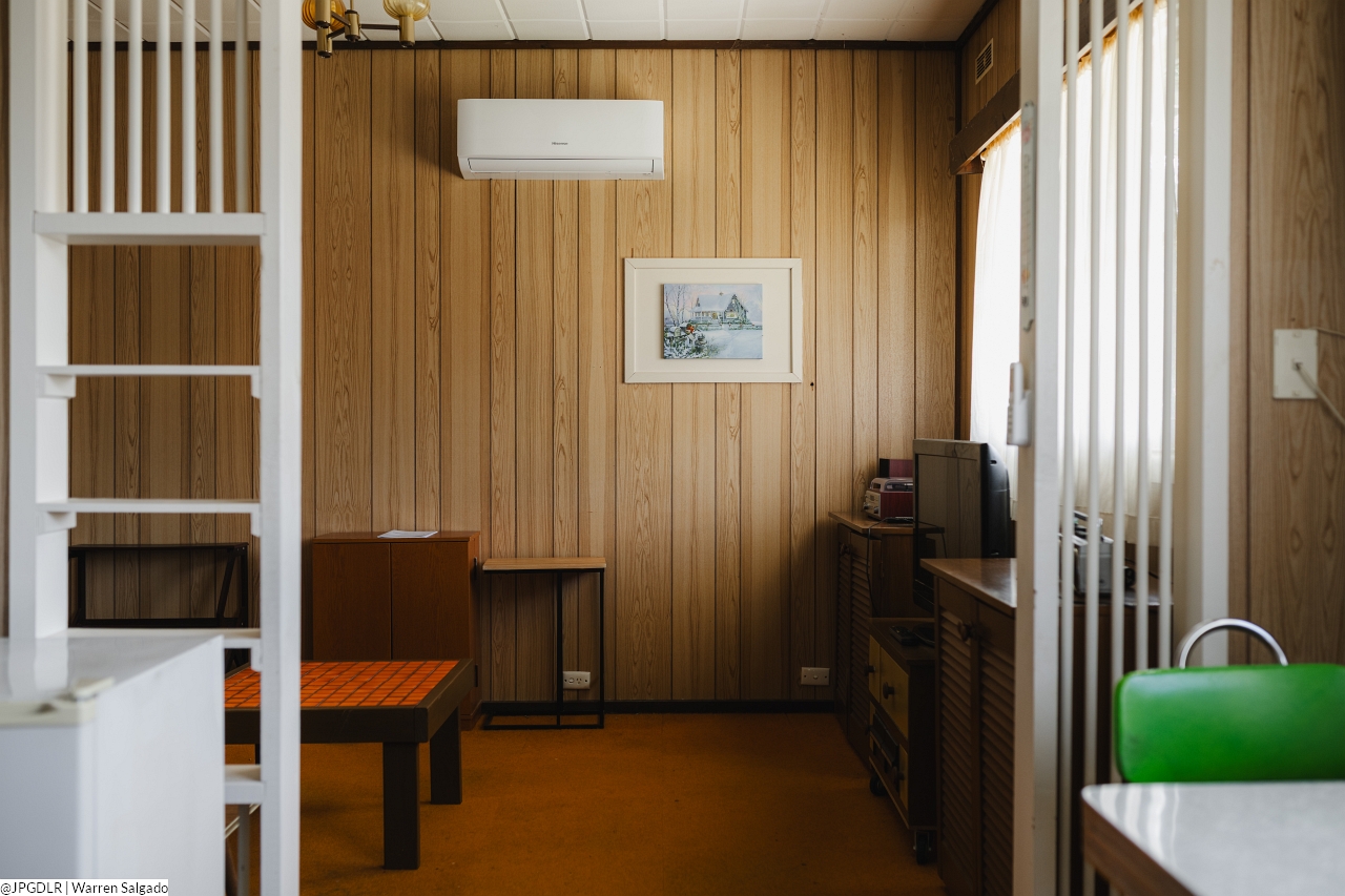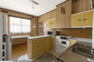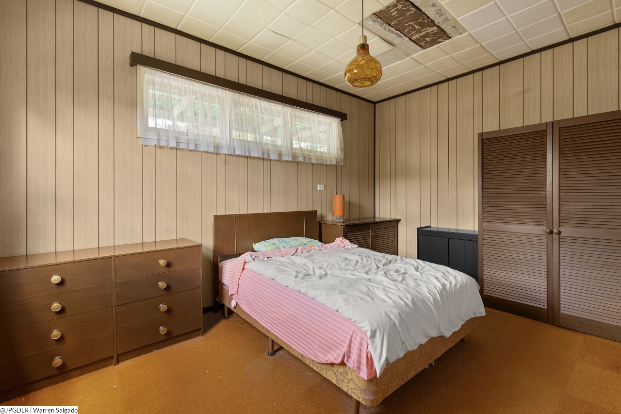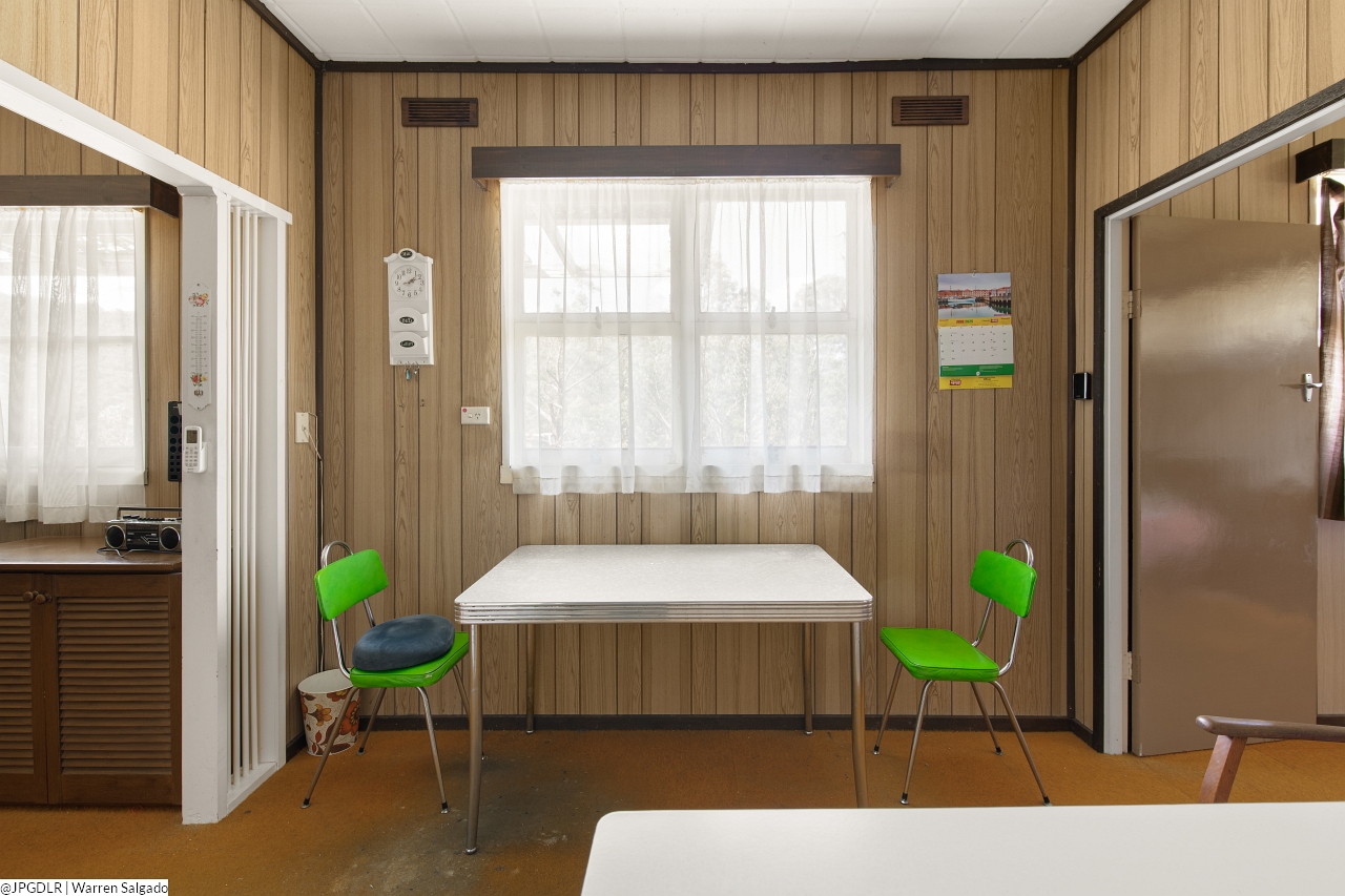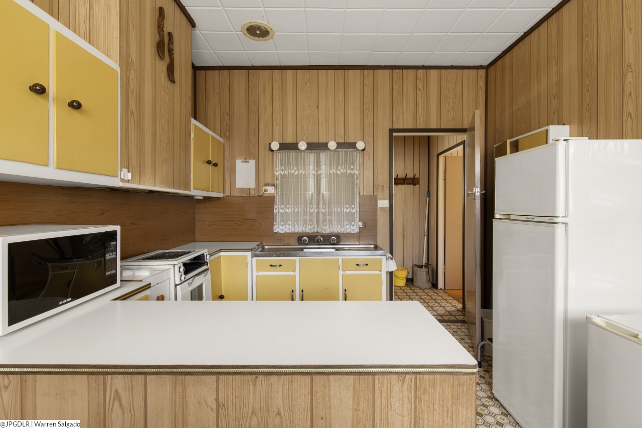 Inside, the rooms are dressed in the textures of a long-gone era—wood panelling, vibrant colours, and flooring that shows memories etched in pressure and time. There are patches of worn carpet and vinyl flooring in the high-traffic areas, and some spots where the occupant paused to rest in front of the TV or to listen to some old tunes.