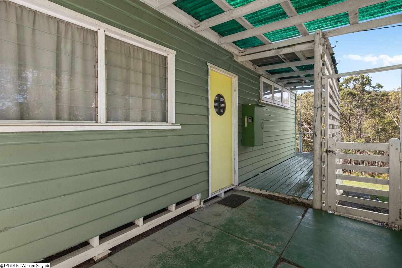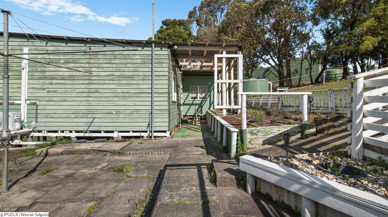 It’s hard to tell which is the front and which is the back of the home. The path seems to lead to the back door, near the laundry. Around the other side is a weathered verandah that partly casts a shadow over a wooden deck and what appears to be the side entry. There’s painted concrete, which carries the patina of years gone. The raised garden beds along the edge add a sense of purpose, even if they’re no longer tended.