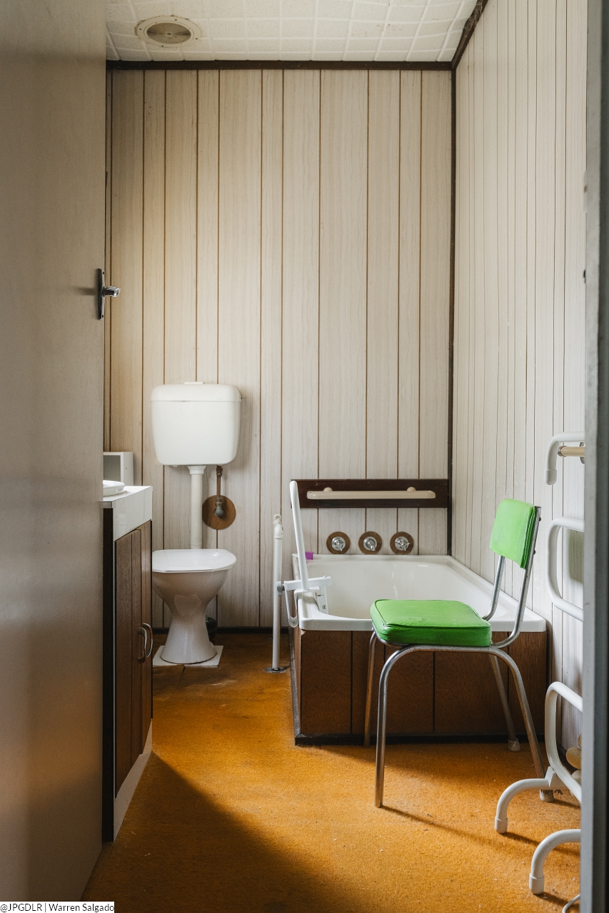 The bathroom’s got a high cistern, a small green chair, and rails that suggest someone needed help getting in and out of the tub. The walls are lined with more wood panelling, and the light is soft, filtered through a small window that’s half-covered by a curtain that’s seen better days.