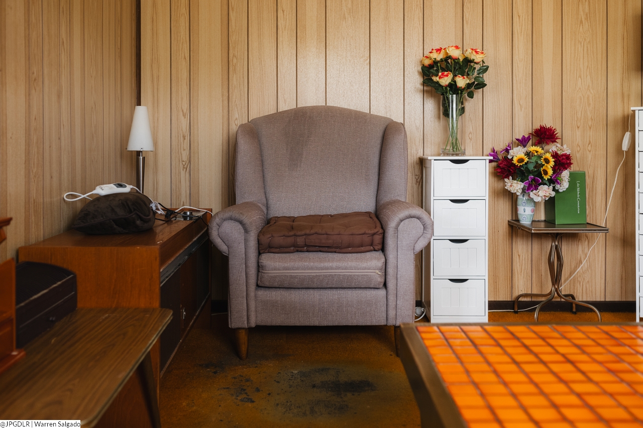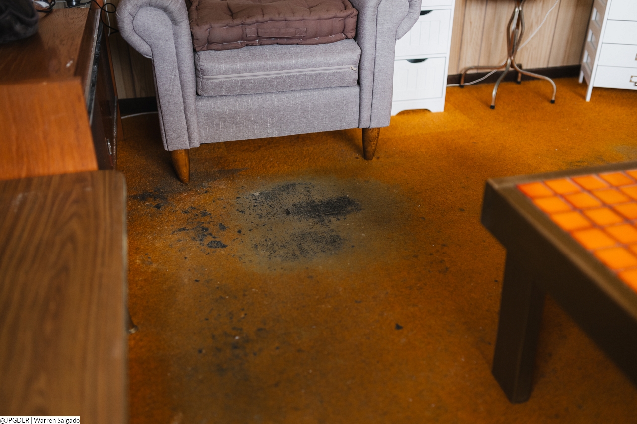 The rooms are lived-in, but no one’s living here now. Wood panelling everywhere. Orange carpet that’s seen better days. A few stains that feel like they’ve been there longer than most memories.